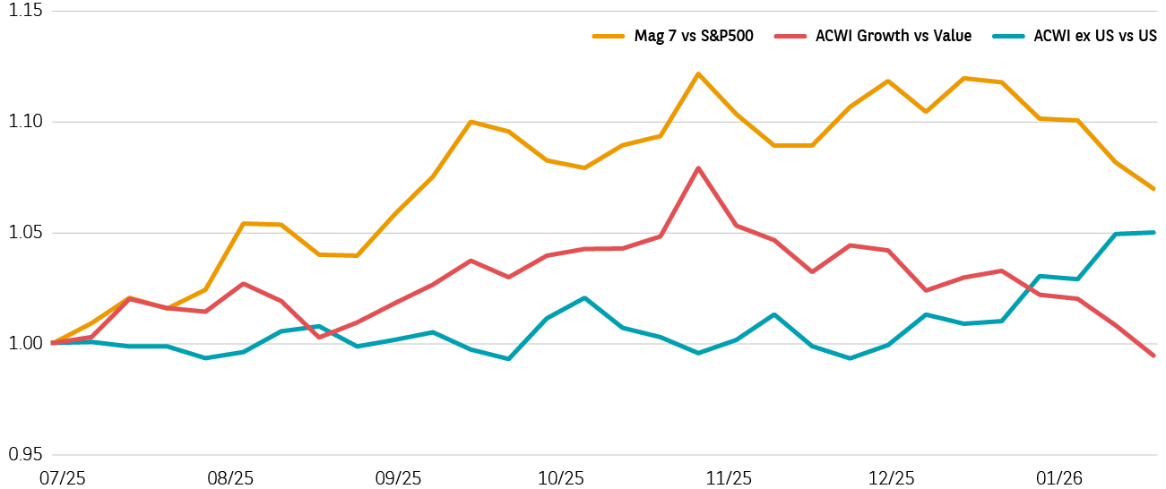 Bron: BNPP AM, Bloomberg – alle relatieve indices herschreven tot 100 per 4 juli 2025 en in USD netto totaalrendement, relatieve indices berekend als ratio’s van de respectieve indexwaarden – MSCI ACWI World ex US, MSCI USA Index, MSCI ACWI World Growth, MSCI ACWI World Value.