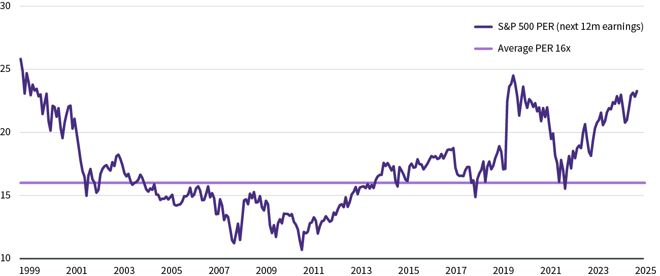 De Amerikaanse winstgroei lijkt veerkrachtig en wordt ondersteund door de uitzonderlijke winstgevendheid van de technologiesector. Maar omdat de waarderingen historisch hoge niveaus halen, is de duurzaamheid van deze winstgroei echt van belang. Zoals uit onderstaande grafiek blijkt, is de KW-verhouding (koerswinst) van de S&P500 nu 23 maal de in de komende 12 maand verwachte winst, wat duidelijk meer is dan het gemiddelde van de afgelopen 25 jaar, dat 16x bedraagt. Om de aandelenkoersen van op dit niveau nog verder te laten stijgen, moet de beurs heel veel vertrouwen hebben in de mogelijke toekomstige winstgroei van de bedrijven. Wij beoordelen de kwaliteit van de groei van de bedrijfswinsten in de VS, de uitdagingen die de bedrijven op hun pad zullen vinden, en de vraag of hun huidige groeicijfers duurzaam zijn.
