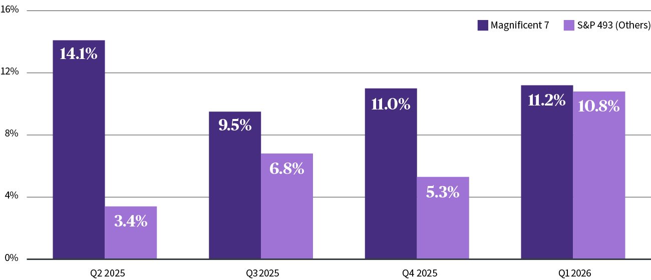 Het bewijs: in het tweede kwartaal van 2025 wist meer dan 80% van de S&P 500-bedrijven de markt positief te verrassen met zijn winst. Zoals in heel aantal recente kwartalen werd de groei aangedreven door de Magnificent 7. Niettemin wordt verwacht dat de winstgroei in 2026 zal verruimen. Verwacht wordt dat de overige bedrijven uit de index, bekend als de ‘S&P 493’, het groeitempo van 16% van de Magnificent 7 op termijn ook halen, zoals blijkt uit onderstaande grafiek. Als de winstgroei meer gespreid wordt over een groter aantal sectoren, voorspellen analisten dat de gemiddelde winst voor de S&P 500 in 2026 boven de 10 percent zal liggen.
